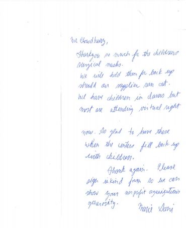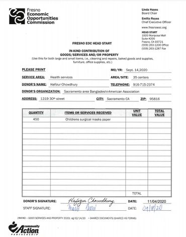 In September 2020, SABAA donated 450 surgical masks by mail for children to the Fresno EOC Head Start for its preschooler education, medical and family services including over 3,000 children within low income families, and other clients who are in need during this pandemic.