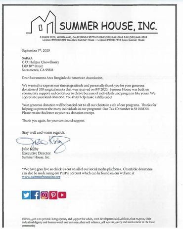 In September 2020, SABAA donated 350 surgical masks to the Summer House Inc for adults with developmental disabilities in both in group homes and those that live in their own residences all